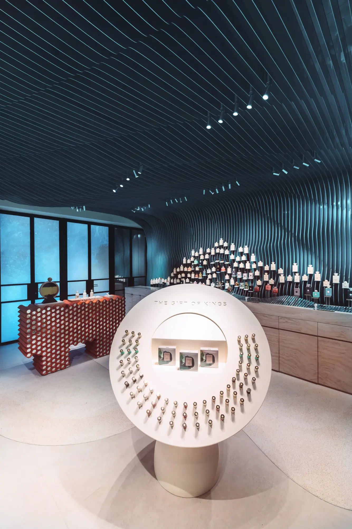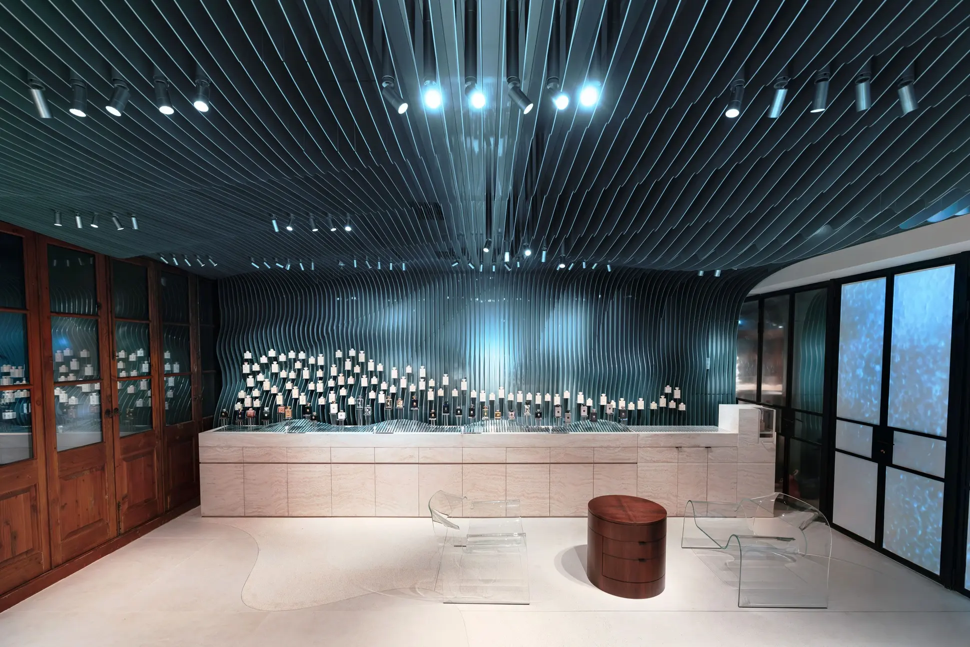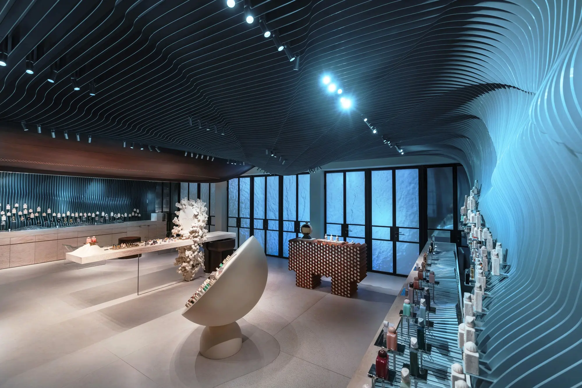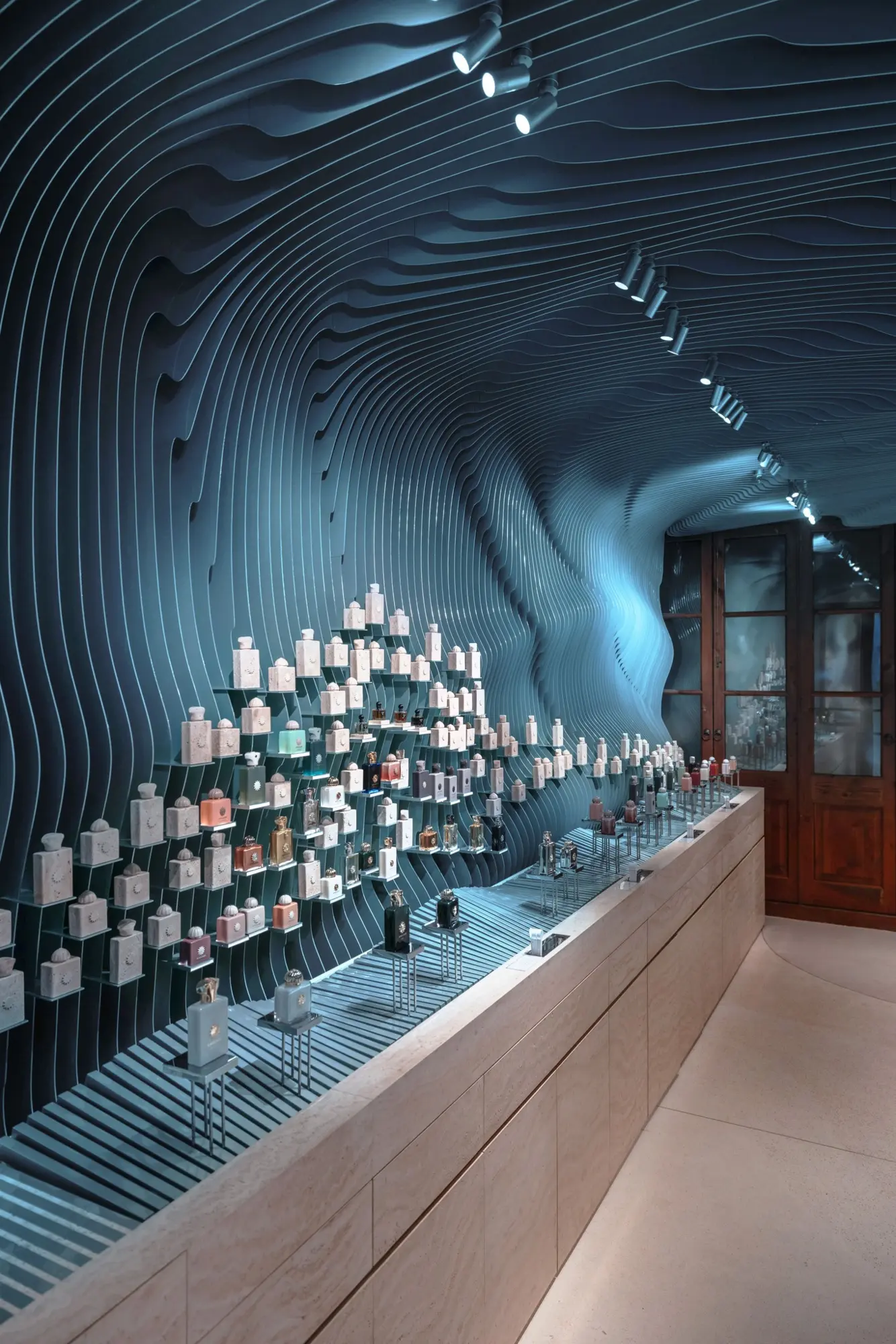 Amouages The Sillage in Zhang Yuan, Shanghai, wurde von Héroïne als poetisch-immersives Flagship gestaltet. Inspiriert vom omanischen Erbe, zeigt die Boutique eine wellenartige Decke aus türkis lackiertem Metall, kinetische Duftinszenierungen und korallenartige Formen. Das 140 Jahre alte, denkmalgeschützte Gebäude blieb in seiner Substanz erhalten. Die Boutique besteht aus lokalem Stein, Holz, Glas und Metall, ist plastikfrei und verzichtet auf temporäre PLV – ein ästhetischer, ressourcenschonender Ort, in dem Duft zur Erzählung wird.