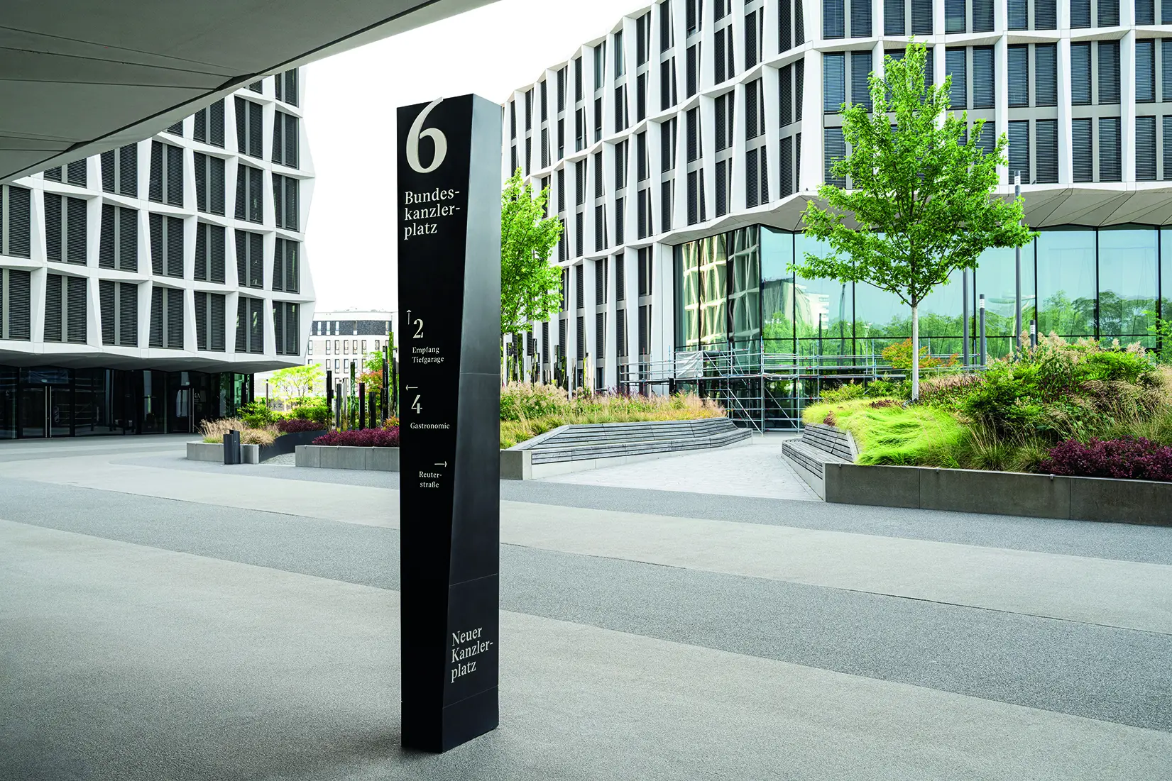 Die von Form & Fokus entworfene Signaletik für das Gebäudeensemble „Neuer Kanzlerplatz Bonn“ überträgt die spezifische Architektur in ein identitätsstiftendes Gestaltungskonzept. Eigens entwickelte Stelen, Schrift-zeichen und Piktogramme zitieren polygonale Baukörper und trapezförmige Fassadenelemente und verbinden Architektur und Wegeführung zu einer gestalterischen Einheit. Zwei- und dreidimensionale Elemente mit skulpturaler Präsenz schaffen Orientierung und führen Besucher elegant durch Außenraum, Foyers, Konferenzbereiche und Tiefgarage. Kontrastreiche, plastische Typografie entfaltet auf verschiedenen Materialien besondere Wirkung.
