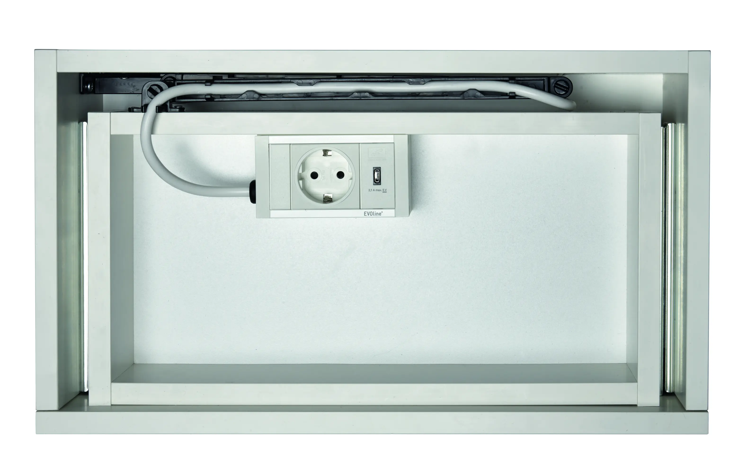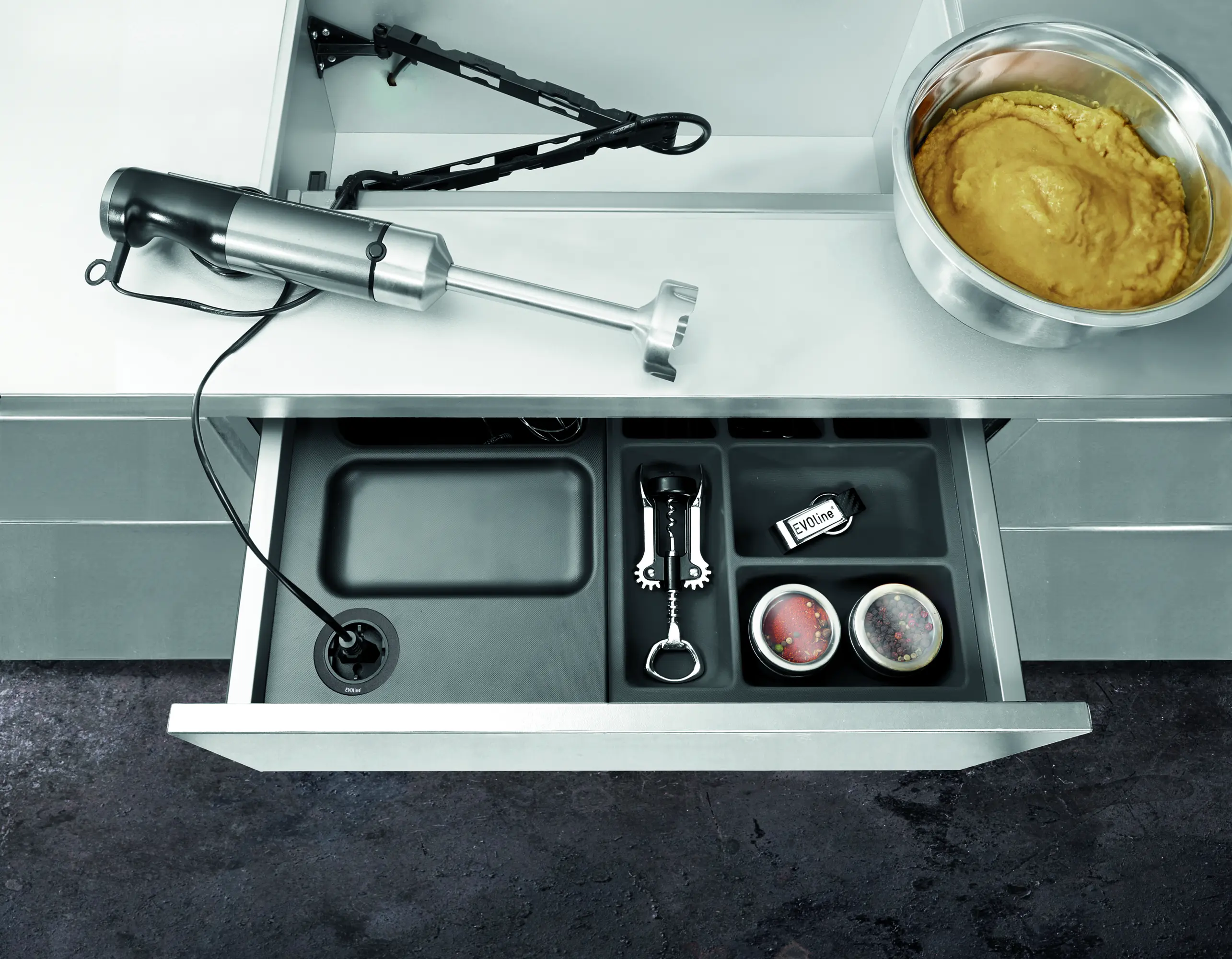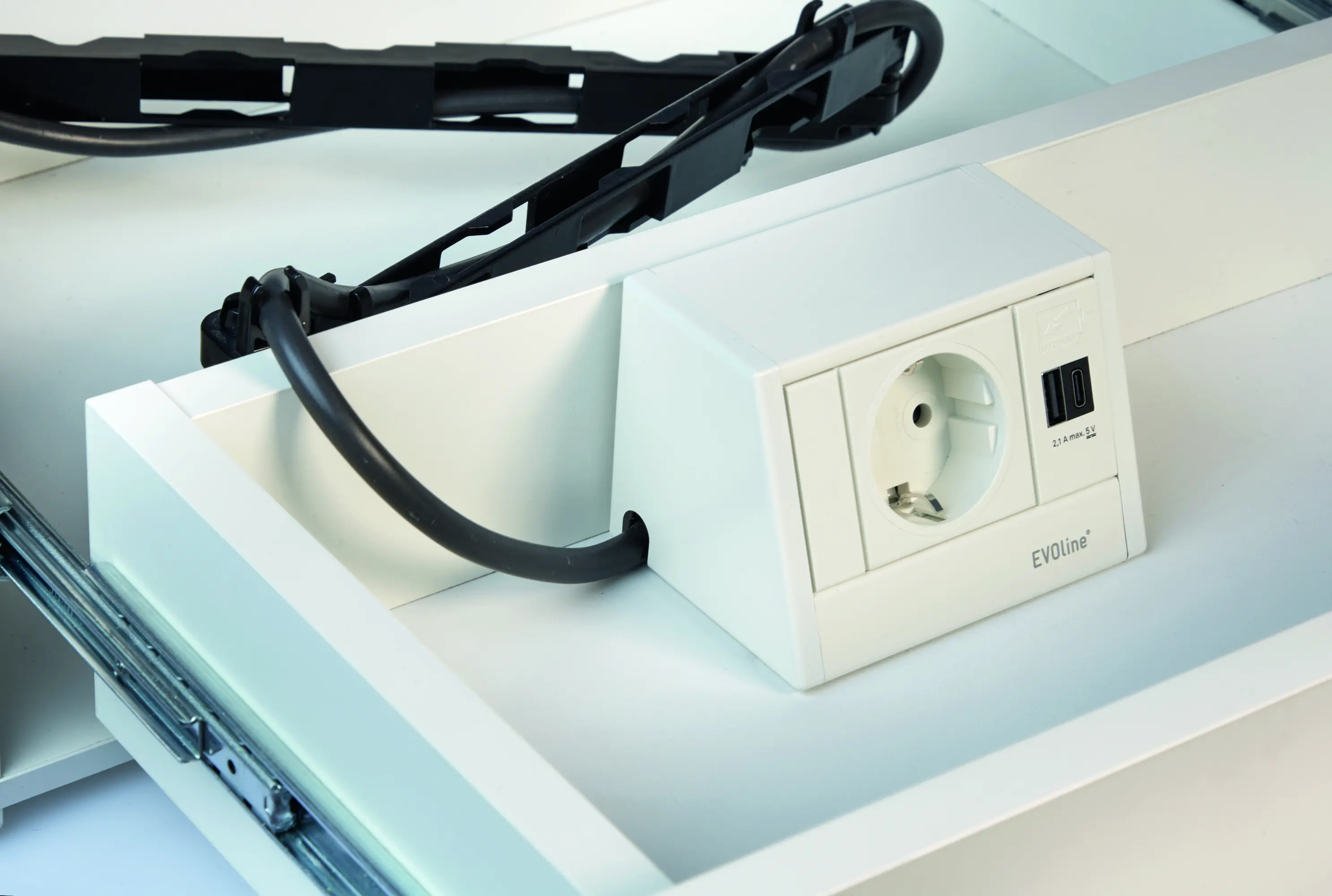 Wing, der Kabelmanager für alle beweglichen und ausziehbaren Möbelteile - waagerecht und senkrecht. Die perfekte Lösung für Steckdosen und Charger-Systeme, die in Schubladen integriert werden sollen. Der Wing führt Leitungen platzsparend hinter dem Schubfach, ohne diese zu knicken oder einzuklemmen und gewährleistet ein reibungsloses Öffnen und Schließen. Ob in Küchen oder Werkräumen, an Holz- oder Metallrückwänden, die Einbaulösung ermöglicht individuelle Montageoptionen, so dass Anschlüsse einfach erreichbar und sicher im Stauraum verbaut sind.