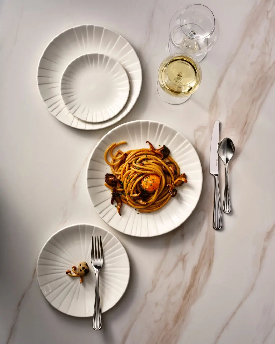Alina vereint zwei starke, sich ergänzende Ästhetiken: die Schlichtheit, Geradlinigkeit und Zurückhaltung japanischen Designs gepaart mit einem lockeren, zugänglichen und lässigen Stil, der den skandinavischen Lebensstil verkörpert. Die Alina-Prägung lenkt den Blick auf die Mitte des Stücks und verleiht der Kreativität des Küchenchefs Gewicht und Fokus. Alina bietet ein Zusammenspiel aus Licht und Linien, das eine entspannte und moderne Plattform für moderne Bankette und gehobene Gastronomie bietet.