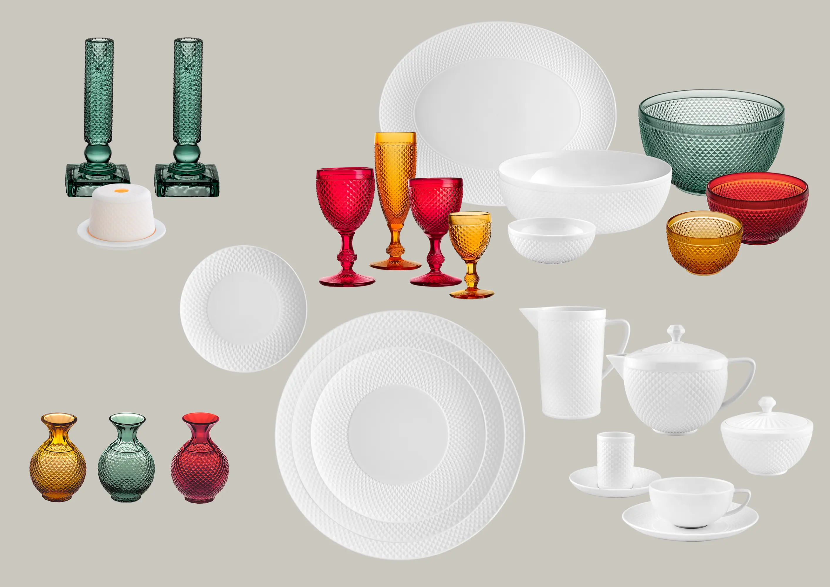 Bicos, eine symbolträchtige Glaskollektion von Vista Alegre, hat im Laufe der Zeit neue Formen und Farben angenommen und so ihre Attraktivität und Funktionalität gesteigert. Um den Erwartungen der wachsenden Zahl von Bewunderern dieser Linie gerecht zu werden, bringt Vista Alegre jetzt ein Service aus Bicos-Porzellan mit Reliefmotiven auf der weißen Glasur auf den Markt. Ideal kombinierbar mit den Kelchen, Krügen, Salatschüsseln und Gläsern von Bicos in den verschiedenen Farbtönen oder passend zu den unterschiedlichsten Geschirr- und Bestecksets.
