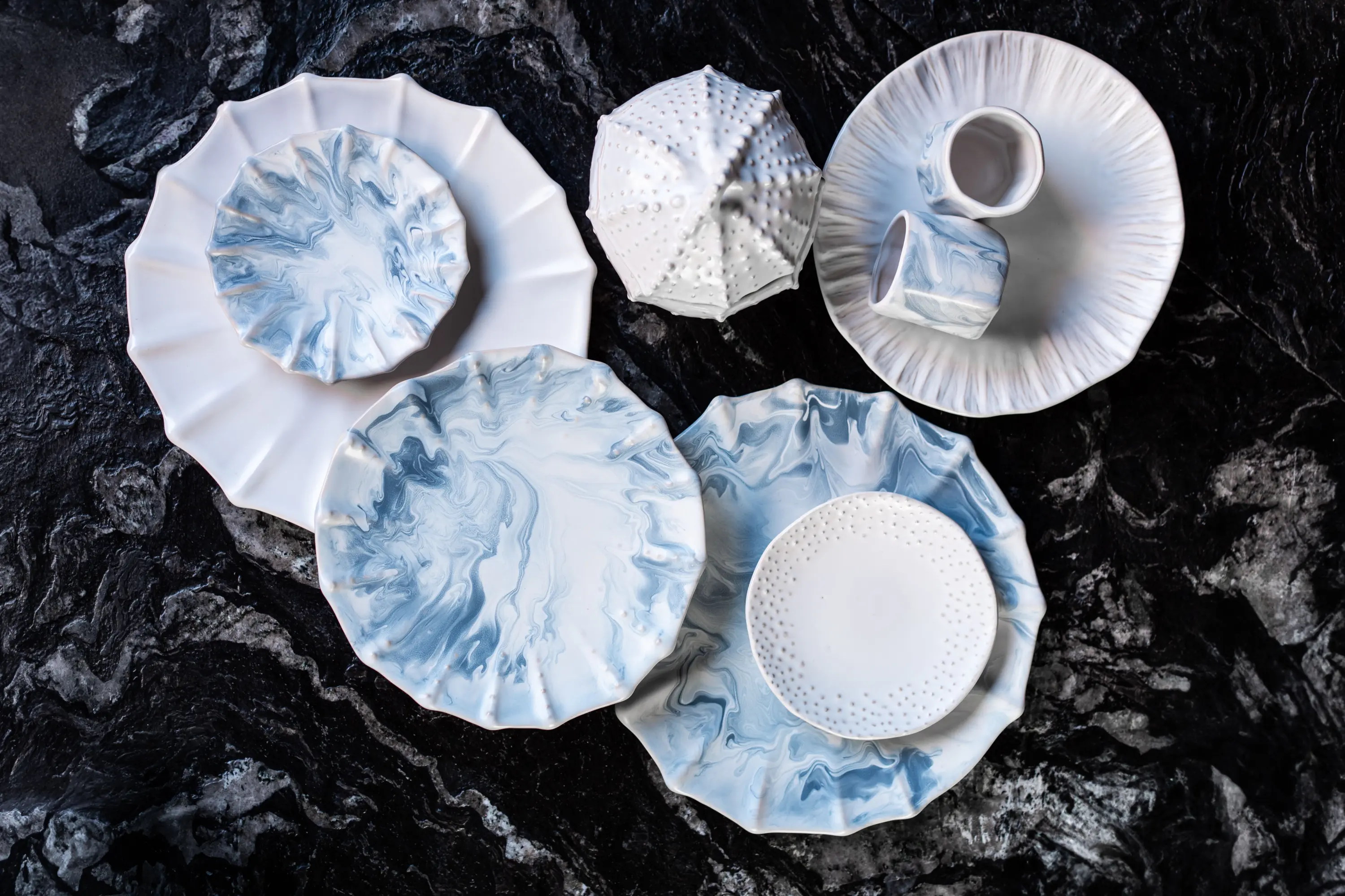 Die Bewegung des Ozeans in matt marmorierten Oberflächen in tiefen Blautönen offenbart die subtile Dynamik des Meeres und die Gelassenheit der Gezeiten. Jedes Stück entsteht als unwiederholbares Fragment und lädt zu einem sinnlichen Kontakt ein, bei dem Form, Textur und Farbe verschmelzen, um den Tisch in einen Ort der Betrachtung und des Teilens zu verwandeln.