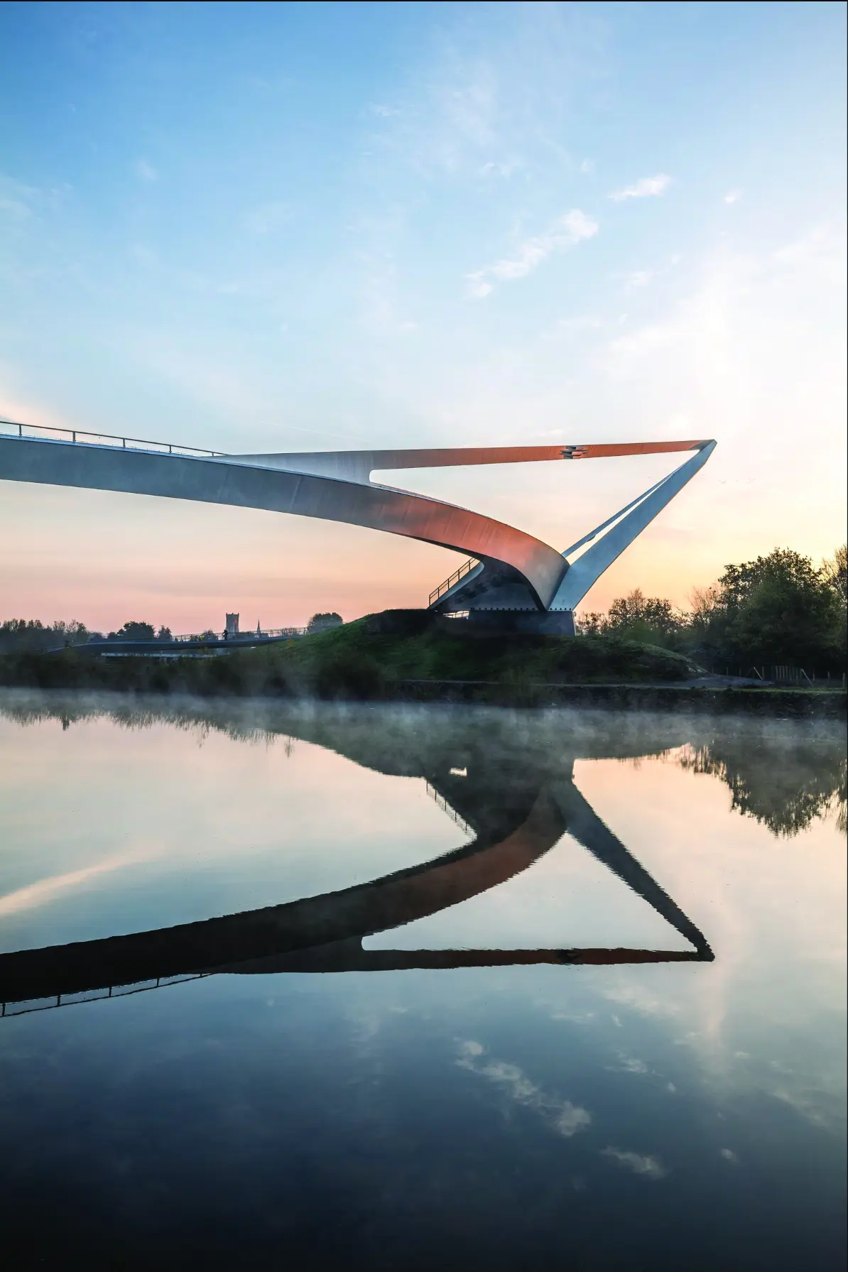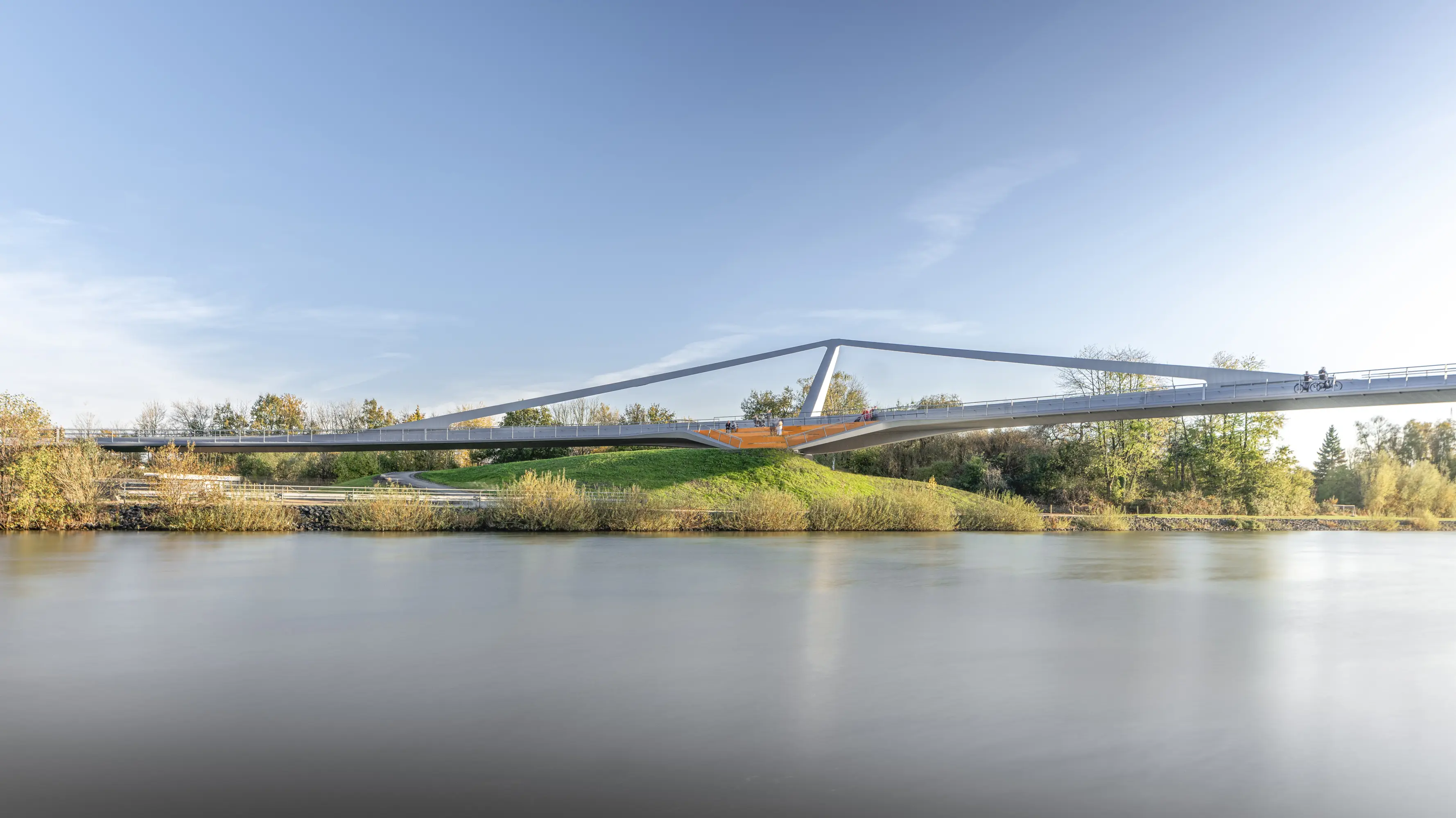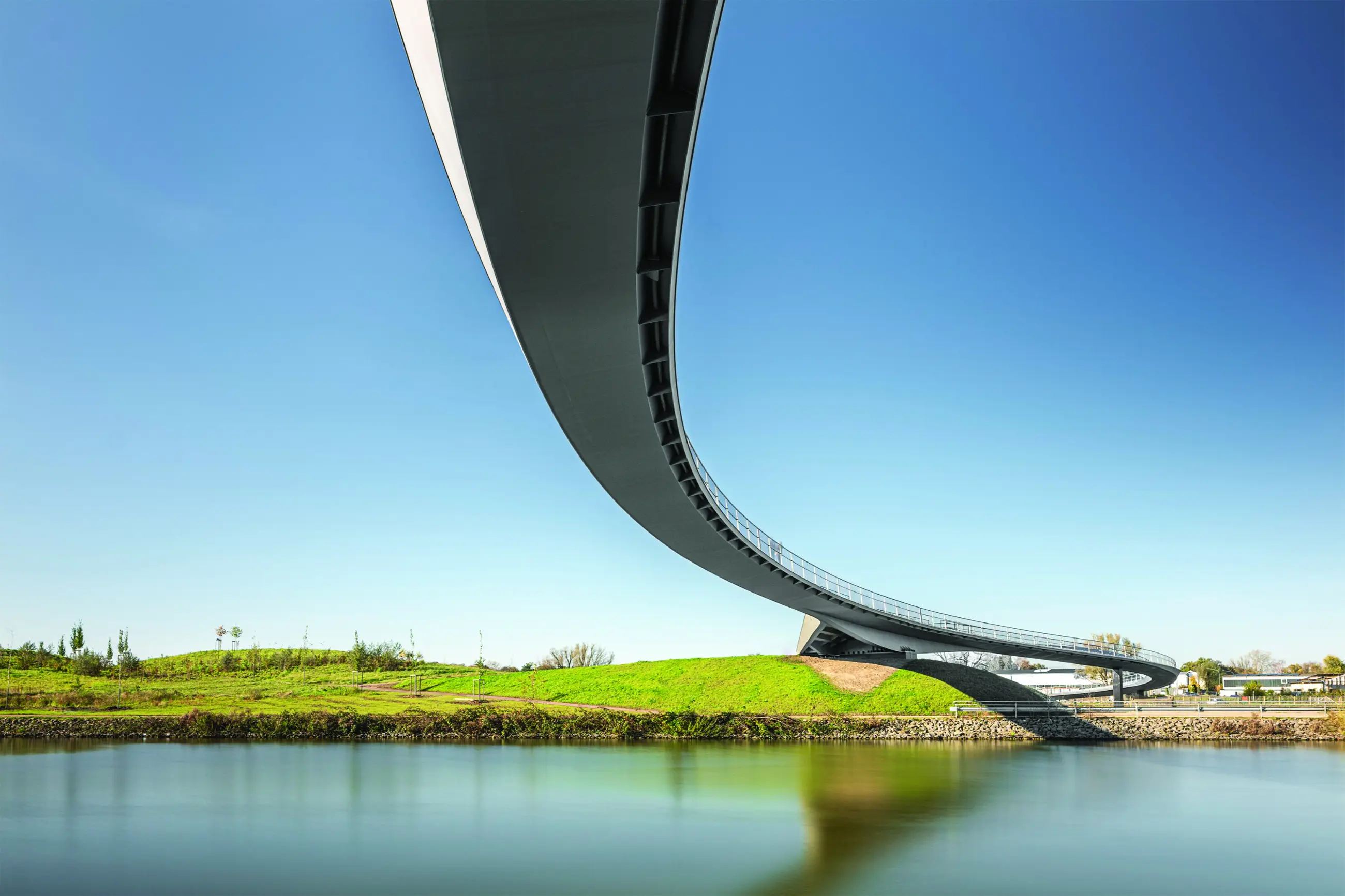 Die 412 m lange Silver-Arrow-Brücke steht für eine zukunftsweisende Vision moderner Infrastruktur, in der statische Präzision, architektonische Eleganz und kulturelle Bedeutung verschmelzen. Als markantes Symbol und horizontale Landmarke des regionalen Wandels geht sie weit über eine reine Verkehrsverbindung hinaus: Sie schafft Orte der Begegnung, eröffnet weite Ausblicke und verbindet zwei neu entstandene urbane Terrassen zu einem harmonischen Ganzen. Inspiriert von der Dynamik der Landschaft, den Auen, dem industriellen Erbe und dem Zusammenfluss der Emscher wird sie selbst Teil dieser fließenden Topografie.