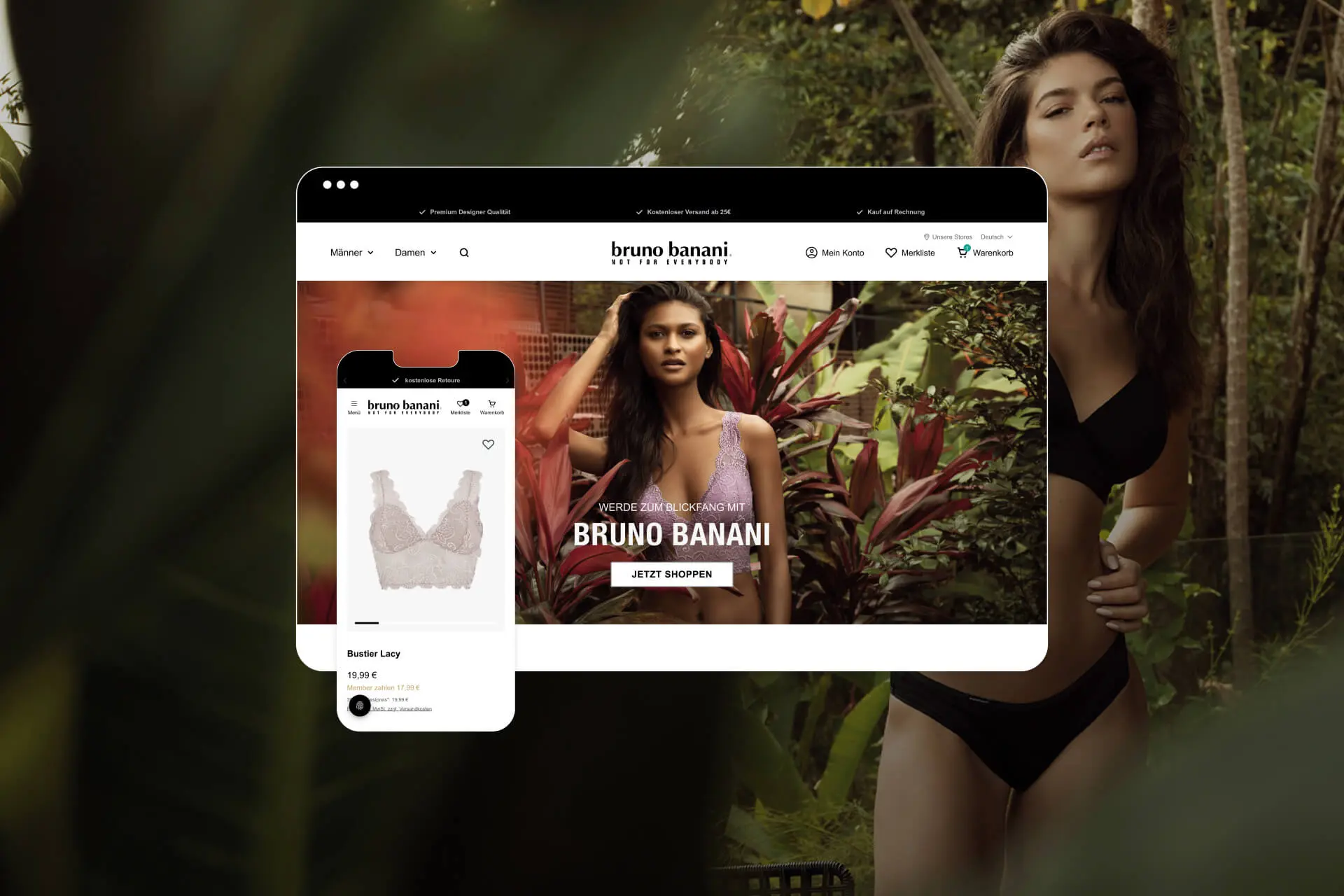 Der Bruno Banani Onlineshop Relaunch auf Shopware 6 umfasst strategische Planung, UI Design und technische Umsetzung sowie die umfassende Koordination aller Beteiligten. Eine klare Trennung der Produktkategorien sorgt für eine gezieltere Ansprache und Nutzer:innenführung. Das Design schafft mit einer neuen Raster-Galerie eine aufgeräumte Darstellung, welche die Präsentation von Produkten und visuell geprägten Kampagnen in den Vordergrund stellt. Verbesserte Funktionalitäten wie eine nahtlose Warenkorb-Integration und optimiertes Cross-Selling bieten Kund:innen ein noch besseres Einkaufserlebnis.