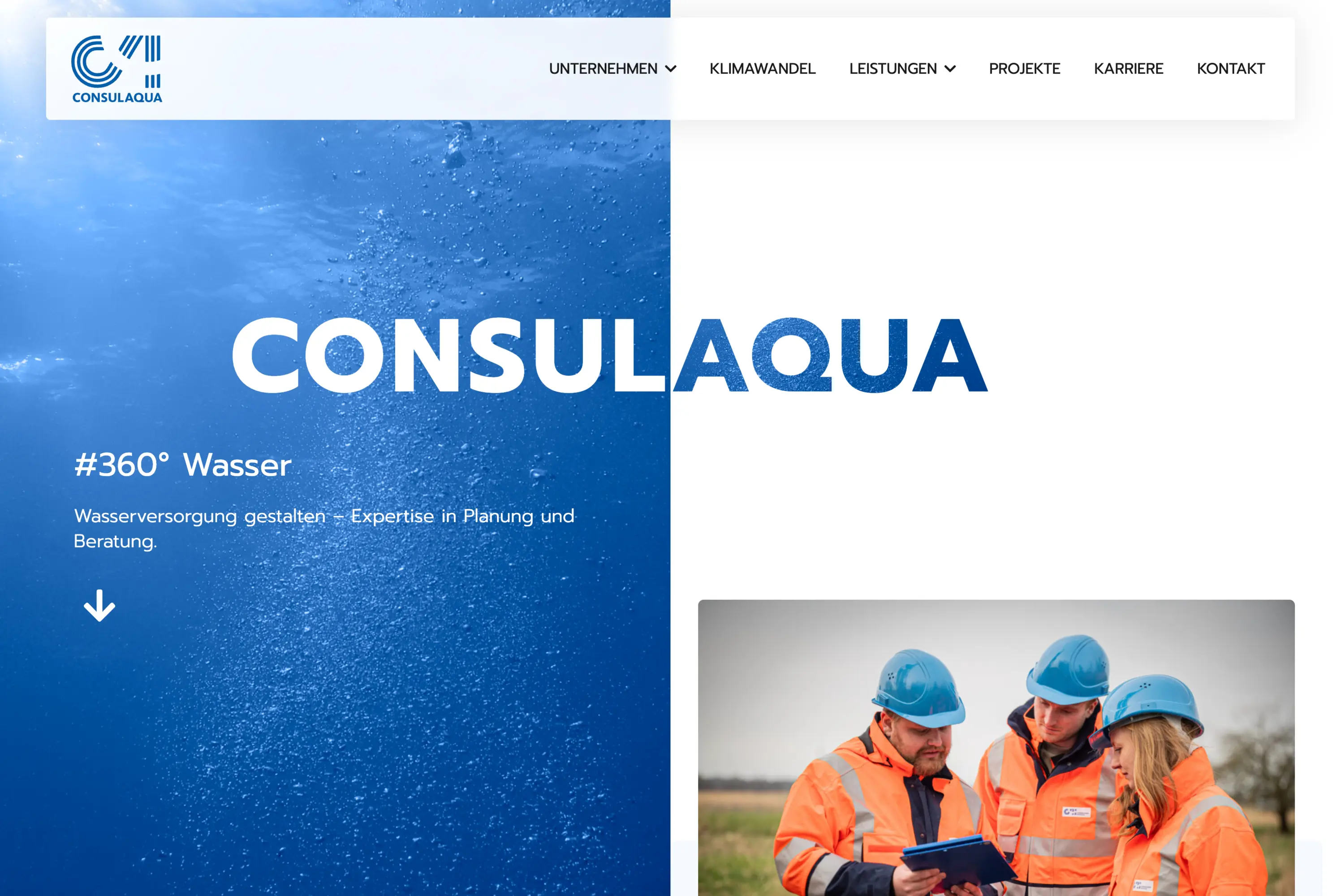 Für CONSULAQUA, einen Anbieter innovativer Lösungen in der Wasserwirtschaft, entwickelten wir eine neue Website auf WordPress-Basis. Ziel war ein modernes, barrierefreies Design gemäß BFSG sowie eine intuitive Struktur. Die Website verknüpft Leistungen, Ansprechpartner und Projekte intelligent miteinander – für maximale Nutzerfreundlichkeit. Der 360°-Ansatz des Unternehmens und seine zukunftsorientierte Ausrichtung spiegeln sich klar im digitalen Auftritt wider.