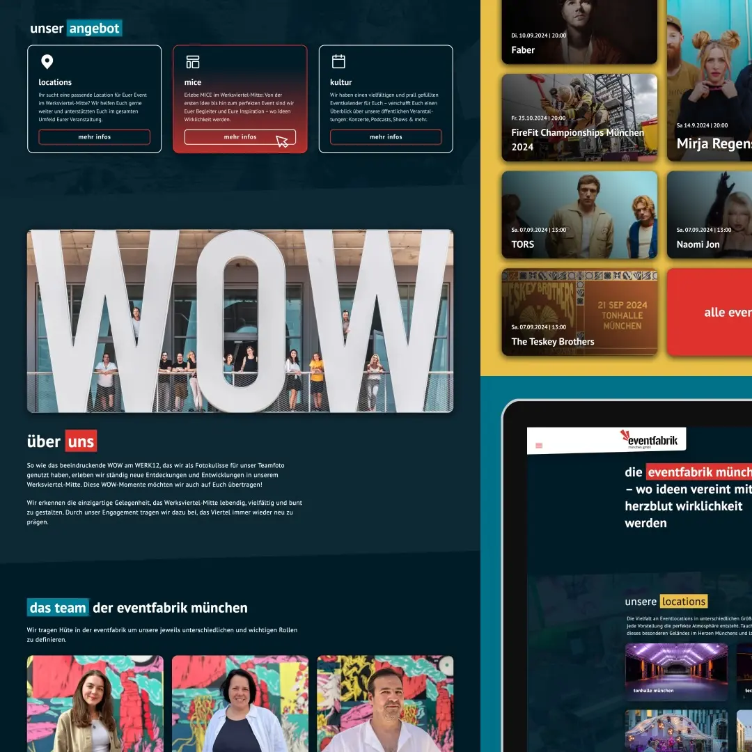 Die neue Website der Eventfabrik München macht Haltung sichtbar: mutig, klar, selbstbewusst und ganz auf Nutzererlebnis ausgerichtet. Im Zentrum steht ein ausdrucksstarkes, gestalterisch durchdachtes Konzept, das zwei Zielgruppen anspricht: Besucher finden schnell aktuelle Events, Veranstalter entdecken die Vielfalt und Atmosphäre der Locations. Eine Artists-Gallery zeigt, wer hier bereits auf der Bühne stand. Design, Inhalt und Struktur erzeugen eine digitale Präsenz mit Charakter – verbunden mit einem klaren Bekenntnis zu nachhaltigem Gestalten. Ein digitales Erlebnis, geprägt vom Gestaltungsanspruch von Luehrsen // Heinrich.
