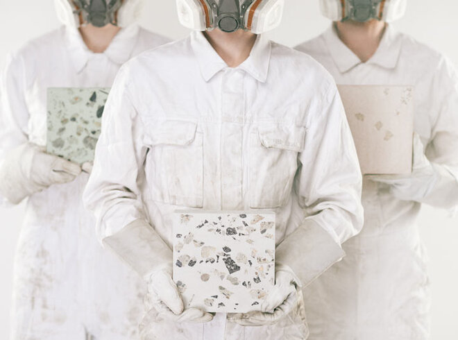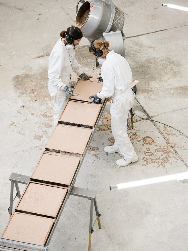 Als Entwicklerinnen und Gründerinnen bilden wir das Kernteam von TFOB und sind für die Entwicklung und Vermarktung von Urban Terrazzo zuständig. Wenn es um die technologischen Anforderungen der selbst entwickelten Baustoffe geht, greifen wir auf das Wissen von Experten zurück und pflegen die Zusammenarbeit mit einem betontechnischen Labor. Aber auch die Kooperation mit anderen Kreativen spielt für das erweiterte Netzwerk von TFOB eine entscheidende Rolle, wenn es um die Wahrung von baukulturellem Erbe geht. Wir legen Wert darauf, dass mit Urban Terrazzo neue lokale Stoffkreisläufe etabliert werden. So verarbeiten wir in unserer deutschen Manufaktur Abriss aus dem Berliner Umland. In Italien hingegen kooperieren wir mit einem größeren Werk, welches die Baustoffabfälle aus dem Umland Veronas verarbeitet. Die Produkte von Urban Terrazzo sind so einzigartig wie ihr jeweiliger Ursprungsort.