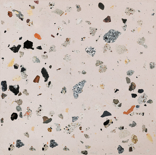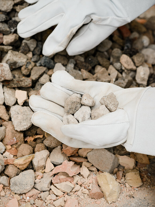 Als Designerinnen ist es uns ein Anliegen, sogenannten Abfallmaterialien zu neuem Leben zu verhelfen. Allein in Berlin fallen jährlich rund 5 Millionen Tonnen Bauschutt an. Mit Urban Terrazzo überführen wir diese Reste alter Architekturen in einen nachhaltigen Materialkreislauf. So entsteht nicht bloß ein kreislaufgerechtes Material, sondern der Lebenszyklus eines Gebäudes wird geschlossen.